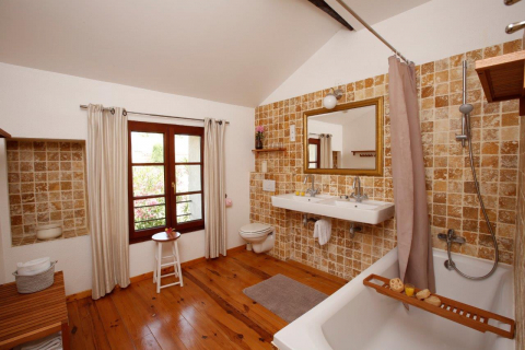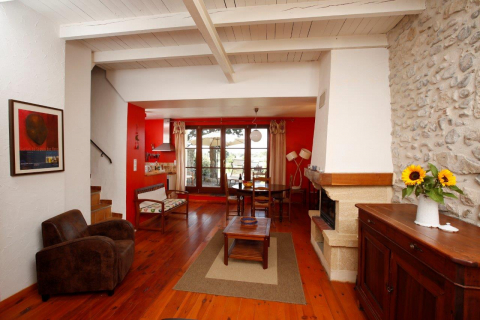 Über einen eigenen Eingang gelangt man in ein wunderschönes Wohn- und Esszimmer mit Kamin, Holzfußboden und offener Küche. Außerdem befindet sich dort ein Duschbad/WC und ein Schlafzimmer (1 Doppelbett 1,60 x 2m, auch trennbar in Einzelbetten). Im Obergeschoss sind zwei Schlafzimmer mit jeweils zwei Doppelbetten (1,80 x 2m, auch trennbar in EinzeIbetten 0,90 x 2m) und ein großes Badezimmer mit Badewanne.